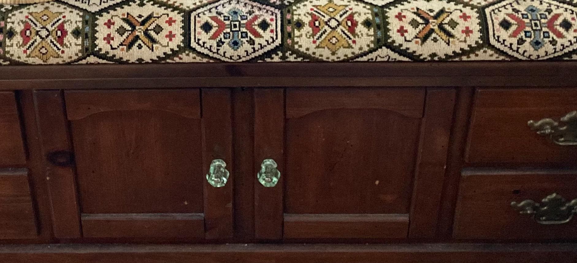 Teal glass furniture knobs. The price is for one. We have 18 available. Please check the quantities available box for updated availability. They are all in very good shape with minor surface wear. The edges are rounded at the top and the knob tapers in from top to bottom and then comes out again at the bottom where they rest. They are all identical. They measure 1" W x 1 1/4" D. the screw is 2 1/8" L. The nut is approximately 1/4". They weigh 1.2 ounces. It will be shipped via USPS. All small items are sent within 1-2 business days (so excluding weekends and holidays) with tracking and are packaged carefully to make sure your item arrives to you safely.
